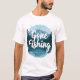 Ein stilvolles Design mit einem Bergsee und dem Text "Gone Fishing".