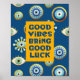 Good Vibes Take Good Luck, mauvais motif oeil est un design amusant et énergique avec beaucoup de styles différents de mauvais oeil sur un arrière - plan bleu. Au centre, le panneau jaune vif contient le message. Le mauvais oeil porte bonne chance et protège contre le mal.