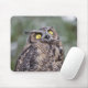 A mousepad featuring a wide-eyed great horned owl. This young owl was turning its head to watch a song bird. It resulted it a rather humorous wide-eyed expression.
