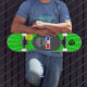 Ein Skateboard, der einen Cartoonartgorilla hat, Gläser 3d mit einem grünen Hintergrund zu tragen.