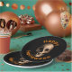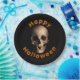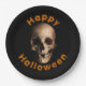Grosser verfallener Schädel auf schwarzer Platte mit orangefarbenem "Happy Halloween" um den Schädel.