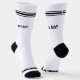 Got fish? Minimalist fishing socks with black lettering on both sides of the calves and minimalist lines on the top and bottom.