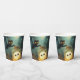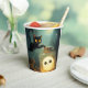 Eine niedliche schwarze Katze fing ein kleines Gespenst in einem Glas.