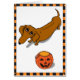 Innerhalb: "Got Leckereien?" Ein hoffnungsvoller Dackelhund schaut oben von einem leeren Kürbissüßigkeitskorb, seine Augen plädierend, damit Sie ihn mit halloweenie Knochen auffüllen.