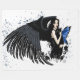 Ein gotischer Engel ganz in Schwarz hält eine schwarze Katze mit blauen Feenflügeln, die beiden sind in einem weißen Hintergrund mit dunkelblauen Farbtupfern. Schwarze Blume am Boden