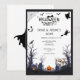 This eerie and enchanting invitation features a black crow silhouetted against a foggy sky, with flying bats swirling around it. The words "halloween party" are written in a gothic font, adding to the invitation's ominous feel. It's the perfect way to invite your friends to a spine-chilling Halloween party where they can come dressed up in their costumes and have a spooktacular time.
