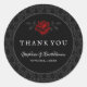 The Gothic wedding Thank you sticker is designed to be elegant and mysterious.The Design features grey and black damask and a red bleeding rose.. The font is in a delicate, almost white shade of gray that contrasts with the dark background.