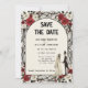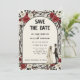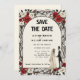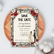 Mit dieser gotisch inspiriert Save the Date-Karte können Sie Ihre romantische Hochzeit in Set nehmen. Dieses Design mit einer bezaubernden Abbildung einer Braut und eines Bräutigams in Vintager Kleidung, gerahmt von dramatischen Rot- und Cremetönen, die mit dornigen Reben verwoben sind, erinnert an eine zeitlose, stimmungsvolle Eleganz. Ideal für Halloween-Hochzeiten, gotische Feiern oder Vintage Romantik-Themen, diese rett-the-date-Karte erfasst die geheimnisvolle Schönheit Ihrer Liebe. Vollständig anpassbar mit Ihren Namen, Datum und Hochzeitsdetails - ein einzigartiger Weg, um Ihre Gäste dazu zu bringen, ihre Kalender stilvoll zu kennzeichnen.