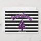 Eine lustige Weihnachtszeit-Party Einladung mit einem lila Weihnachtsbaum mit Skullen überall auf der Welt, schwarz-weißen Streifen und einem Ort für Ihre Freundlichkeit Party Details. Frohe Creepmas!