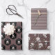 Maßgeschneiderte, handgezeichnet, edle, gotische Verpackungsblätter in Pflaume lila. Blatt #1: Enthält einen gotischen schwarzen Rahmen mit bearbeitbarem Text und eigenem Familiennamen. Alles vor einem lila Hintergrund, der von Spinnennetzen bedeckt ist. Blatt 2: Das elegante, gestreifte Taupe-Grau- und Pflaumenmuster. Blatt 3: Ein wunderschönes Skull- und Rose-Muster in den roten Farbtönen, Vintager Rose und Cremes, alles vor einem lila Hintergrund.