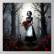 +AI ART+ Gotisches Robotermädchen mit roten Blume und ihrem glitzernden Kitty stehend in einem Wald. Bist du ihre wahre Liebe? Sie ist für dich gewartet.