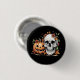 Ein festlicher gotischer Halloween-Knopf mit einem spitzigen Schädel und einer lächelnden Jack-o’-Laterne umgeben von Herbstlauben und Blume - der perfekte Mix aus Unterhaltung und Spaß, der einen überwältigend stilvollen Knopf kreiert. Perfektes Geschenk für Schulveranstaltungen, Halloween-Party.