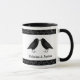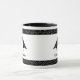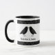 Diese phantastische Hochzeitsszene-Tasse zeigt ein digitales Kunstbild eines Paares von schönen schwarzen Raben, die sich gegenüberstehen und aussehen, als würden sie sich küssen. Sie sind schwarz mit beatenen Augen und grauen Schnallen und Füßen. Weiße Sterne auf schwarzem Hintergrund über und unter den Vögeln. Es gibt einen eigenen Text, damit Sie die Namen des glücklichen Paares angeben können.