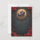 Gotische Beförderung mit Rädern und Rose. Eine gotische Kutsche, die von zwei Raben mit Oberhüten gezogen wird, Set in einem verzierten, goldenen Rundrahmen. Die Kutsche ist mit Blume geschmückt und hat ein Kreuz darüber. Der Hintergrund ist dunkel, die Struktur grün strukturiert und der Rahmen ist von rote Rosen und dekorativen goldenen Schnörkeln umgeben. Die Stimmung ist dunkel, elegant und etwas skurril.