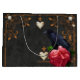 Gotischer Schädel und Raven. Gotisches Design, das die mystische Atmosphäre unserer Verbindung widerspiegelt. Ein majestätischer schwarzer Rabe sitzt auf einer tiefen rote Rose, sein Kopf leicht geneigt und sieht auf die links - ein Symbol für Neugier und Kontemplation. Der Hintergrund ist dunkelgrau, fast schwarz, und zeigt auf leise Weise die Kontur eines Schädels, die an die Vergänglichkeit erinnert und gleichzeitig die Tiefe unserer Liebe betont.