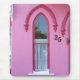 Ein rosa gotisches Viktorianisches Fenster hat in einer Hütte in Oak Bluffs auf Martha's Vineyard den Schnee in seinen Ecken gefangen. Die Martha's Vineyard Campmeeting Association (MVCMA), eine beliebte Attraktion auf der Insel, ist Zuhause zu Hunderten von Viktorianischen Lebkuchen-Hütten. Oak Bluffs war einst als Hütte City bekannt. Martha's Vineyard liegt in Massachusetts, in der Nähe von Cape Cod.