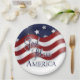 Das Design von "Gott segne AMERICA" hat einen marineblau-blauen Hintergrund mit weißen Sternen oben und rot-weißen Streifen in der Mitte. Die Flagge ist schattiert, um wie eine winzige Flagge auszusehen. "God Bless" ist oben auf der Fahne in einem handgemalten Aussehen mit Weiß auf der Unterseite und Marineblau auf der Oberseite. AMERIKA ist in ganz Marineblau. Große Teller auf Papier, die Sie am nächsten 4. Juli oder patriotisches Party verwenden können.