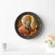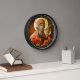 Diese religiös geprägte Wanduhr besticht durch ein traditionell ostorthodoxes Ikonenbild der heiligen Mary Theotokos (die Mutter Gottes / Träger Gottes), das im traditionellen byzantinischen Stil mit Ei-Tempel und Goldblatt auf einem Holzpaneel gemalt wurde.
