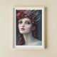 Ein schönes Plakat zeigt ein atemberaubendes Bild der Göttin des Winters, der Marzanna (slawisch) oder der Khione (griechische Schneegöttin) in einem kunstvollen Porträtstil mit reichen Farben und einer üppigen Blumen- und Antlerkrone.