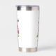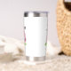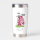 This cute travel mug features a stylish pink watercolor golf bag filled with clubs, sitting on a patch of green grass. The design appears on both sides of the mug for easy viewing from any angle. A simple serif initial monogram is placed directly on the bag, seamlessly blending into the artwork. Beneath the monogram, the full name is shown in elegant script typography for a personal touch. The monogram is currently in a dark gray, almost black, to match the bag’s accents, but you can change it to any color you prefer.