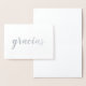 Diese schöne Silberfolie hat das spanische Wort "gracias" in Pinsel (Pinselstrich) Skript. Die Innenseite der Karte ist leer für Ihre persönliche Nachricht. Ideal für jede Zeit, die Sie jemandem für ein Geschenk oder Freundlichkeit danken möchten. Auch in Goldfolie erhältlich.
