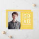 Célébrez l'obtention du diplôme de votre fils ou de votre fille par des annonces "Moderne Grand Bloc". Le design minimaliste comporte un arrière - plan jaune à l'avant et à l'arrière, le mot "Grad" à l'intérieur d'un cadre blanc rectangulaire et des espaces réservés pour une image et un texte personnalisé.