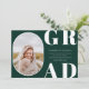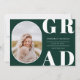 Runded Front Foto Rahmen, Senior Class Abschluss Ankündigung/Einladung. Dunkelgrüner Farbhintergrund, weißer Fetttyp "GRAD" und Textvorlagen für den Namen des Absolventen, die Jahrgangsklasse und die Schule. Auf der Kartenrückseite befinden sich zwei zusätzliche Foto- und Textzeilen für Informationen zum Party oder andere Informationen über den Absolventen.