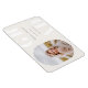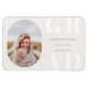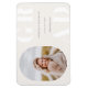 Runder Foto-Rahmen, Senior Class Abschluss Ankündigungsmagnet. Weiche, beige Hintergrundfarbe für Elfenbein, weißer Fetttyp "GRAD" und die Koordination der grauen Textanzeige für den Namen des Absolventen, die Klasse des Jahres und die Schule.