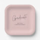 This modern graduation paper plates feature trendy, handwritten-style typography and space for the graduate’s name on a dusty pink background.
