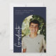 Faire-part/invitation de graduation de photo avec cadre d'arc, scénarisé moderne "diplômé". Caractéristiques, typographie blanche sur arrière - plans bleu marine.