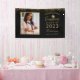 This custom graduation banner to celebrate your graduate features a photo on the left framed in faux gold accented by gold faux glitter on a black background.To the right in faux gold script it reads "Congratulations" and below "graduate 20XX" with your name and school to personalize. Designed by artist Susan Coffey