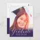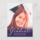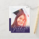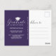 Annoncez votre remise de diplômes 2020 à votre famille et à vos amis avec cette carte postale moderne personnalisée pour votre faire-part photo et invitation à la fête. Cet élégant modèle design présente votre photo avec une superposition violette et un script moderne en lettres blanches à la main qui dit "Graduate" et votre nom, et classe/année ci-dessous. Le verso de la carte contient plus de détails de votre graduation avec l'invitation de la fête pour vous permettre de customiser accentué par une casquette blanche de graduation sur un arrière - plan violet. Félicitations pour votre diplôme ! Conçu par l'artiste Susan Coffey.