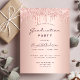 Une carte d'invitation féminine, féminine et glamour pour une soirée de remise de diplômes 2025 (ou toute année). Glamour avec élégante et moderne rose doré arrière - plan et décoré avec des gouttes de parties scintillant en or rose, look goutte à goutte de peinture. Modèle pour le nom et les détails de la fête. Le texte Graduation et le nom sont écrits avec un script de style manuel moderne. Texte de couleur or rose foncé. Retour : arrière - plan rose d'or et gouttes de gliter. Conseil : Si vous ne voulez pas qu'il ressemble à une carte postale, cliquez sur customiser, allez à l'arrière et retirez le séparateur et le timbre postal.