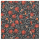 Granatäpfel mit üppigen Blätter und reichhaltigen roten Früchten erstrecken sich über einen schwarzen Hintergrund. Eine sekundäre Ebene verblasst subtil, wodurch Tiefe hinzugefügt wird. Traditionell auf Papier mit Markern gemalt, werden die Elemente gescannt und in Fotoshop zu einem Muster zusammengesetzt.