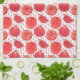 Ein hübscher Küchentücher mit hellroten Granatfrüchten mit Vollfrüchten, Halbscheiben und Scheiben auf einem Hintergrund von Granatkörnern illustriert mit Aquarell.