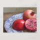 Das Design zeigt ein Foto, das ich von einem Stillleben gemacht habe. Das Stillleben hat drei Granatapfel und eine gemusterte blaue und weiße Platte. Der Teller befindet sich auf einem alten Holztisch mit einem schönen, blauen, bunten Hintergrund.