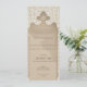Cette faire-part de mariage est un hommage à l'architecture islamique exquise, avec une arche magnifique comme une entrée symbolique à une union joyeuse. Le design est une splendide tapisserie de tons crème et taupe, accentuée par l'élégance d'un emblème calligraphique en albâtre au sommet de l'arc. Des colonnes de Chevron dans des tons subtils d'avoine et de kaki encadrent la merveille architecturale, tandis qu'un arrière - plan de blé et de beige fournit une toile qui parle de classe intemporelle. L'arabesque tourbillonnante et les motifs floraux en ivoire et les éclats de feuilles d'or célèbrent un riche héritage, faisant de cette invitation un portail vers le nouveau commencement du couple dans un style qui honore le passé et embrasse l'avenir.