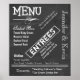 Grand menu de mariage réalisé dans un aspect tableau noir gris charbon foncé. Le texte blanc fantaisiste avec différentes polices ajoute une touche décontractée et amusante à votre réception. Personnalisez le texte avec vos éléments de menu et ajoutez d'autres champs de texte en personnalisant ce superbe menu pour votre mariage.