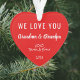 Cadeau de Noël mignon pour grand-mère et grand-père. Sur le devant, votre image remplit un cadre en forme de coeur. Au contraire, vous pouvez personnaliser l'expression "Je t'aime" ou "Nous t'aimons", et personnaliser s'ils sont appelés "Grand-mère & Grand-père", "Nana & Papa", "Maman & Poppop", etc. Vous pouvez également ajouter les noms et l'année des petits-enfants ou des petits-enfants, le tout dans la typographie blanche contre un arrière - plan rouge.