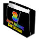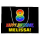 Ce sac cadeau coloré, amusant et joyeux à thème d'anniversaire comporte un grand nombre de "8" et le message "HAPPY BANTHDAY", tous deux avec une couleur motif inspirée par un gradient de spectre arc-en-ciel, avec un nom de destinataire personnalisé jaune gras. L'arrière - plan est noir de couleur. Un sac cadeau d’anniversaire amusant comme celui-ci peut être utilisé pour offrir un cadeau ou un cadeau pour célébrer le 8e anniversaire de quelqu’un. [~Z0000477]