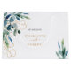 Un arrière - plan blanc chic. Décoré avec de la verdure d'eucalyptus aquarellée, et du feuillage doré. Personnalisez et ajoutez une date et le nom de la mariée et du marié. Texte gris et doré. Parfait pour l'emballage cadeau ou pour les faveurs.