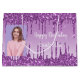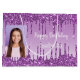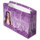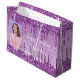 Un sac cadeau pour un anniversaire girly et glamour (tout âge). Un dégradé violet arrière - plan avec des gouttes de parties scintillant violette profonde, la peinture goutte à goutte. Script de style lettré blanc et texte : Joyeux anniversaire. Personnalisez et ajoutez 2 photos différentes, nom.