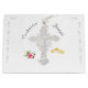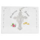 Le design présente l'image douce d'un crucifix au centre. Les noms de Bride et Groom sont encerclés ci-dessus dans une police nuptiale élégante et argentée. La petite image d'une rose rose grace le bas à gauche, tandis que l'image des anneaux mariages dorés est représenté à droite. Conçu pour coordonner avec la "Suite Mariage catholique traditionnelle Rose nuptiale".