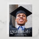 Une élégante et élégante faire-part de graduation qui présente la photo de votre diplômé superposée avec "Graduate" écrit dans un grand type tendance en papier argent réel et son nom, l'école et l'année de classe.