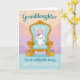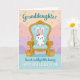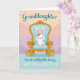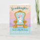 This card features a cartoon-style white bunny with pink ear linings and paw pads, sitting neatly on an ornate chair with a gold frame and tufted aqua-blue upholstery 🐰. A small pink bow rests on the bunny’s head, and the gentle tilt of its face gives it an affectionate, cuddle-ready look. On either side of the chair’s base are two woven baskets, one filled with speckled pink eggs and the other with speckled blue eggs, arranged in a balanced, tidy layout. The background fades from soft peach at the top into lavender and then pale sky blue near the bottom, with scattered polka dots that echo the pastel palette 🌷. Centered near the top, the word “Granddaughter” appears in flowing black lettering, standing out clearly against the lighter gradient. Along the lower portion, the message “Sweet cuddly little bunny HAPPY FIRST EASTER TO YOU” is set in dark text, with “HAPPY FIRST EASTER” in all caps for emphasis. The chair’s carved legs and scrollwork are highlighted in warm gold tones, and the pastel dots float across the gradient backdrop.