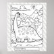 Affiche de coloriage d'un dinosaure avec un arrière - plan pittoresque. Des pistes de dinosaures encadrent l'image. Il y a même un endroit pour signer son nom !