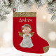 A Cute Angel Christmas Stocking with your child's name, designed in bright red with gold colored trim. To personalize simply insert the first name into our easy template, replacing the sample. Your child will love it.