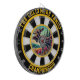 Cette conception circulaire présente un orignal majestueux dans une forêt avec une cible audacieuse.