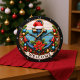 Il s'agit d'un design graphique joyeux et circulaire avec un thème de Noël nautique. L'élément central est une grande ancre bleue et rouge ornée d'un chapeau de Santa rouge festif et d'un poinsettia. L'ancre est dressée contre un arrière - plan de planches en bois rustiques et est entourée de pics verdoyants et d'un assortiment d'ornements de vacances en rouge, bleu et or. Une bannière au bas du cadre indique "BIENVENUE". L'ensemble est entouré d'un cadre circulaire en bois, lui conférant une atmosphère de vacances douillette et côtière.