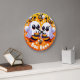Cette horloge ludique présente un visage orange vif orné de charmantes abeilles de style dessin animé habillées en fantômes. Deux grandes abeilles, recouvertes de draps blancs avec des coupes pour les yeux, sont centrées sur la face de l'horloge, avec plusieurs petites abeilles flottant autour d'elles. Les aiguilles de l'horloge sont noires et les chiffres sont blancs, avec l'expression "Boo Bees" écrite dans une police stylisée en bas.